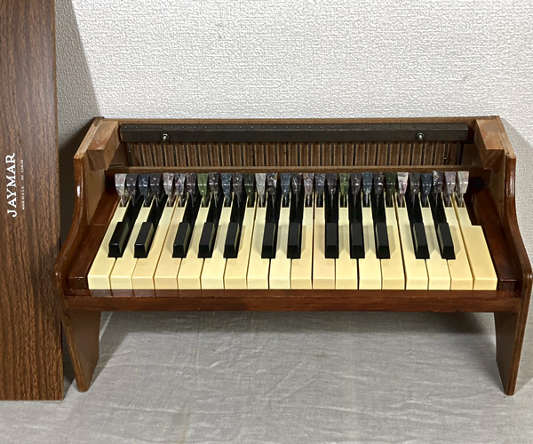 Jaymar(ジェイマー)社のアンティークトイピアノ、ローハイトタイプ。ピッチはトイピアノ独特のホンキートンクな感じですが音質はほぼ均一です。鍵盤がハンマーアクションですので指に感じるタッチ感も実際のピアノ風。天板をネジ留めにしましたので内部クリーニングも容易です。アメリカ製。