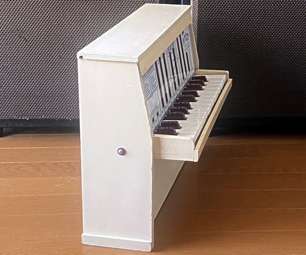 (鍵盤はプラスチック)および鍵盤設置板も木製です。またフランス童謡2曲の弾き方がフロントパネルにプリントされたレアモデル。後期モデル(フロントと設置板が金属製/プラスチックハンマー)と比べるとよりソフトで軽やかな音がします。鍵盤部は収納可能です。