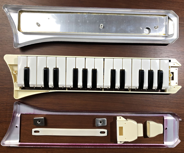 分解して洗浄し衛生的にも問題ありません。鍵盤はショートスケールのコンパクトサイズ。ボディはプラスチック、表裏のボディカバーは金属製。