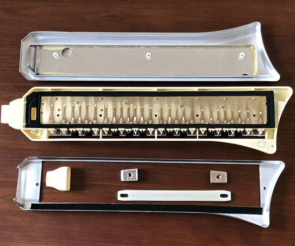 分解して洗浄し衛生的にも問題ありません。鍵盤はショートスケールのコンパクトサイズ、ボディ本体はプラスチック、表裏カバーは金属製。