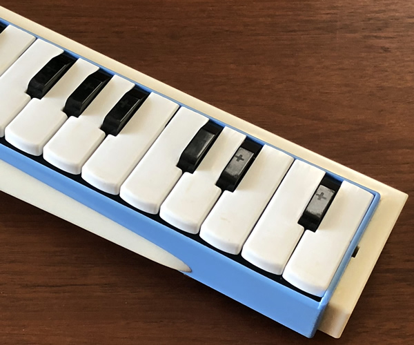 Hohnerのビンテージmelodica pianoと比較すると白鍵サイズは同じ(黒鍵幅は細め)ですが、Keyタッチは柔らかでグリス演奏もスムーズです。主な消耗品(リード部空気漏れ防止材, 鍵盤下のクッション材, 空気入口ウレタン材など)は全て交換。外部内部しっかりクリーニングしてお届けします。ボディ本体はプラスチック製。