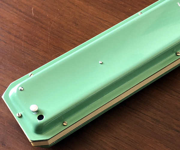 ドイツ・ホーナー社のビンテージメロディカsoprano、初期タイプです。ユニークなボタン式鍵盤を採用、淡いグリーン&ブラックの配色もGOOD!外部内部