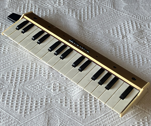 東海楽器のビンテージ鍵盤ハーモニカ。正確な製造年は不明なのですが付属取説の写真を見ると60年代後半〜70年代初期頃の製品ではないでしょうか(未確認)。リード板を設置した本体は木製、表裏カバーは金属製、両サイドはプラスチック…独特なフォルムデザインが格好良いです。水洗いできる部分は