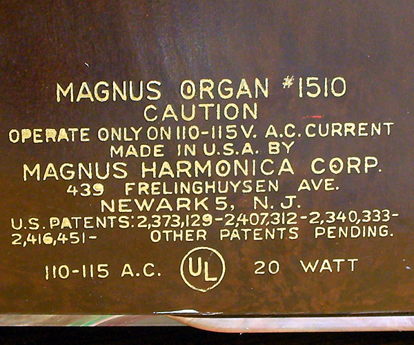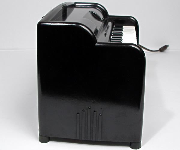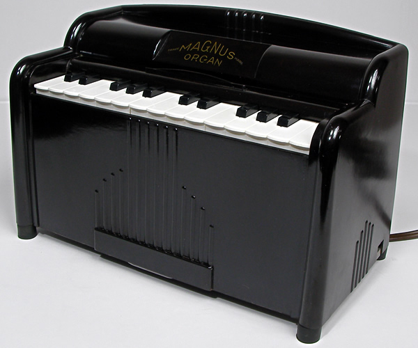1950年代アメリカ製ミニオルガン。内部に設置された電気タービンで風を起こし鍵盤をプッシュすることで各音階のリードを鳴らす仕組み。足踏みオルガンやアコーディオンと基本的には同様の構造です。優しく温かな音色が郷愁を誘います。アメリカンビンテージなルックスも素敵ですね。初期バージョンのためタービン音は少し大きめです(動画参照)。実演奏用というよりもインテリアなどにいかがでしょうか。