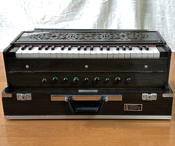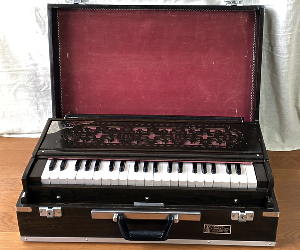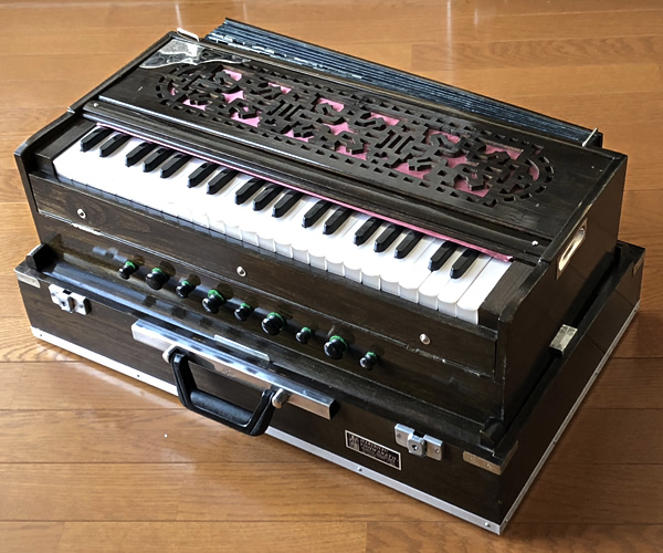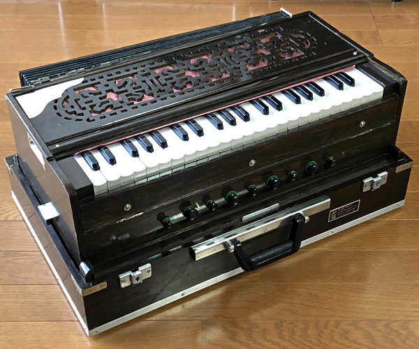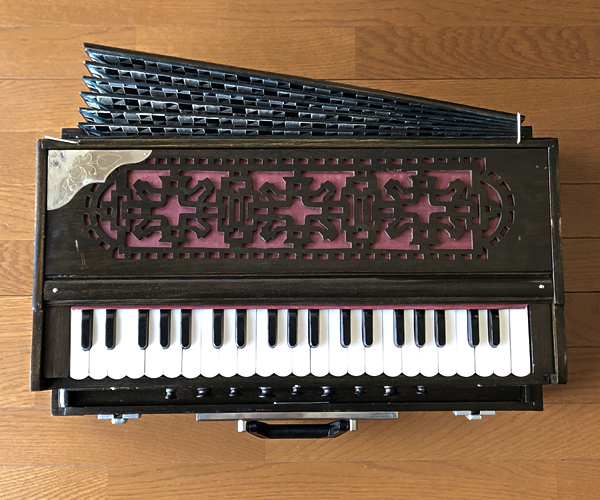 背面のふいごで空気を送ってリードを鳴らす方式のハルモニウム。19世紀半ばに移動可能オルガンとしてフランスで発明され、インド音楽演奏に合うよう独自の発展を遂げたものとされています。本機は3オクターブ半(42鍵)のスタンダードなハルモニウム…弾く時は上蓋を開け本体を引っ張り出して両サイドの金具でロック。持ち運ぶ時はロック解除してトランクケースのように収納、可搬性に優れたハルモニウムです。