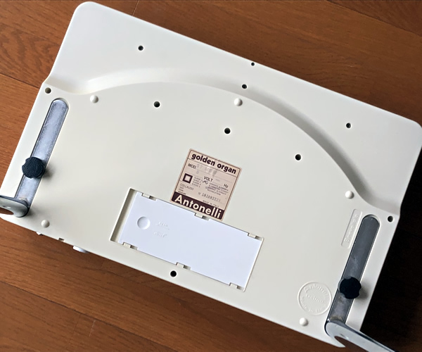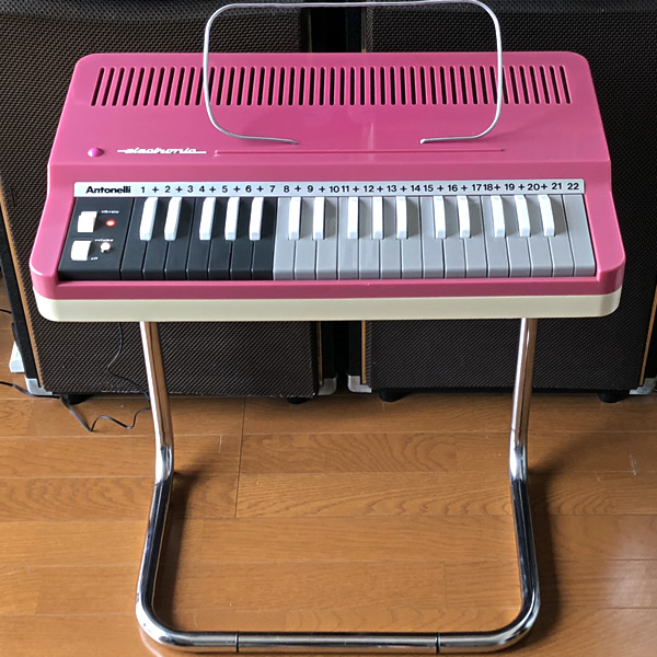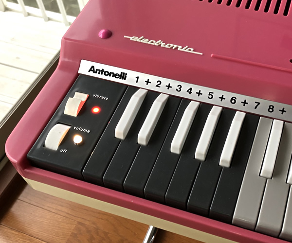 イタリアAntonelli社のビンテージトイオルガン。今回新たに電源ライトとビブラートONライトなどを設置しました。光り物(?)があると楽器感が増しますよね。また各キーに調整用トリマを設置したことでピッチもほぼジャスト。ベース鍵盤とトーン鍵盤はモノフォニックで和音は演奏できませんがベース弾きながらのメロディ演奏は可能です。