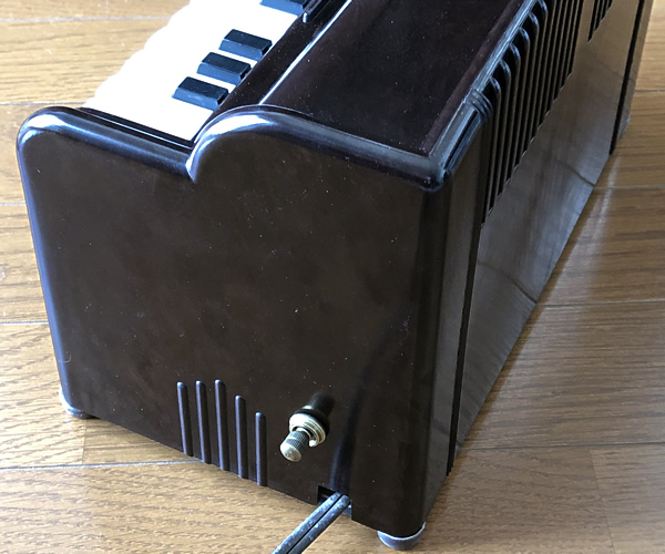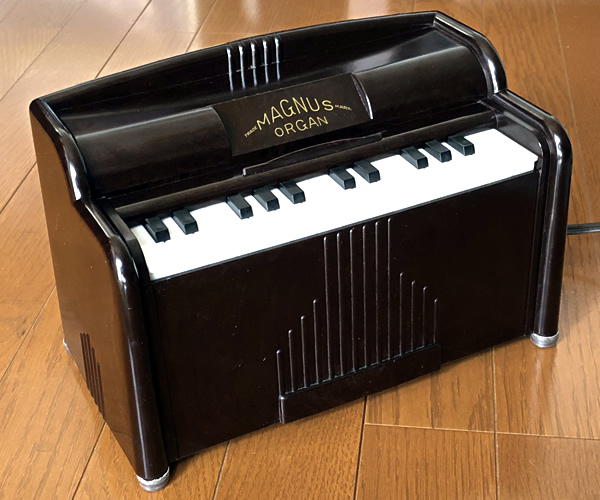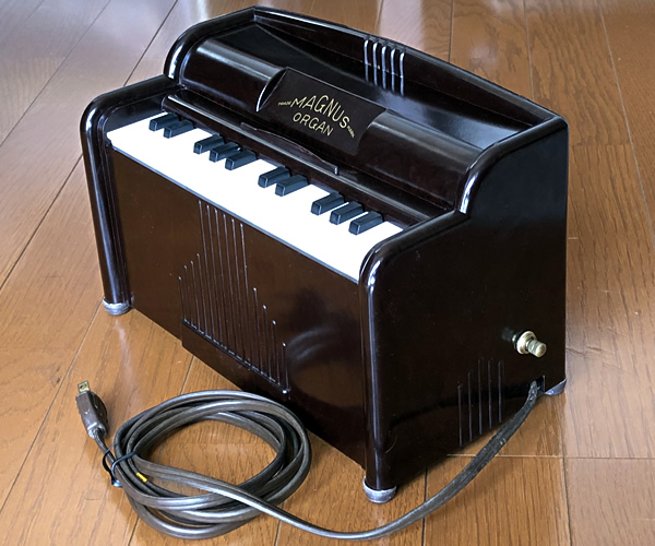 1950年代アメリカ製ミニオルガン。内部に設置された電気タービンで風を起こし鍵盤をプッシュすることで各音階のリードを鳴らす仕組み。足踏みオルガンやアコーディオンと基本的には同様の構造です。優しく温かな音色が郷愁を誘います。アメリカンビンテージなベークライトボディも素敵ですね。土台となる底面はレアな木製でしっかりとした作りとなっております。タービン音は少し大きめです(動画参照)。